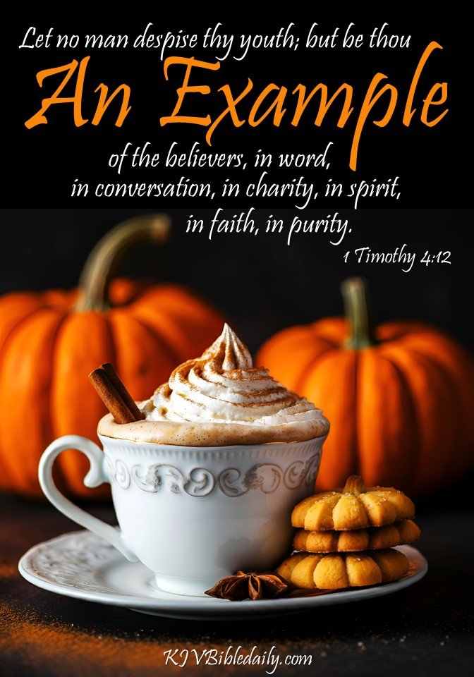 1 Timothy 4:12 KJV Share this:Tweet Click to share on WhatsApp (Opens in new window) WhatsApp Click to print (Opens in new window) Print Click to share on Reddit (Opens in new window) Reddit Click to email a link to a friend (Opens in new window) Email Share on TumblrPocket Click to share on Telegram (Opens in new window) Telegram Like Loading... Related