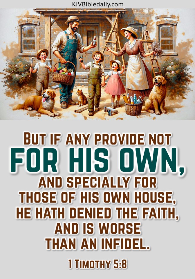 1 Timothy 5:8 KJV Share this:Tweet Click to share on WhatsApp (Opens in new window) WhatsApp Click to print (Opens in new window) Print Click to share on Reddit (Opens in new window) Reddit Click to email a link to a friend (Opens in new window) Email Share on TumblrPocket Click to share on Telegram (Opens in new window) Telegram Like Loading... Related