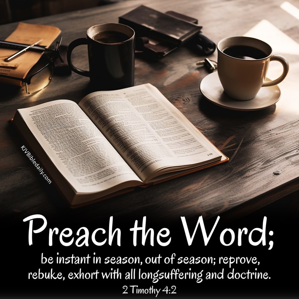 2 Timothy 4:2 KJV Share this:Tweet Click to share on WhatsApp (Opens in new window) WhatsApp Click to print (Opens in new window) Print Click to share on Reddit (Opens in new window) Reddit Click to email a link to a friend (Opens in new window) Email Share on TumblrPocket Click to share on Telegram (Opens in new window) Telegram Like Loading... Related