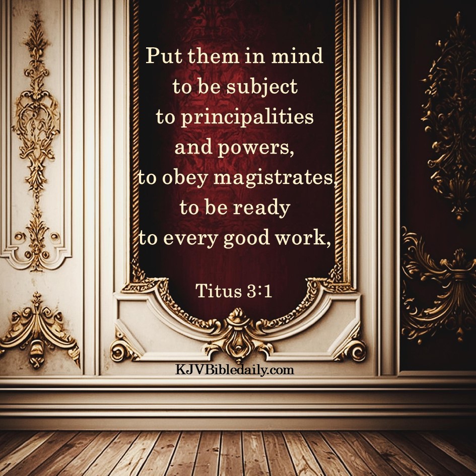 Titus 3:1 KJV Share this:Tweet Click to share on WhatsApp (Opens in new window) WhatsApp Click to print (Opens in new window) Print Click to share on Reddit (Opens in new window) Reddit Click to email a link to a friend (Opens in new window) Email Share on TumblrPocket Click to share on Telegram (Opens in new window) Telegram Like Loading... Related