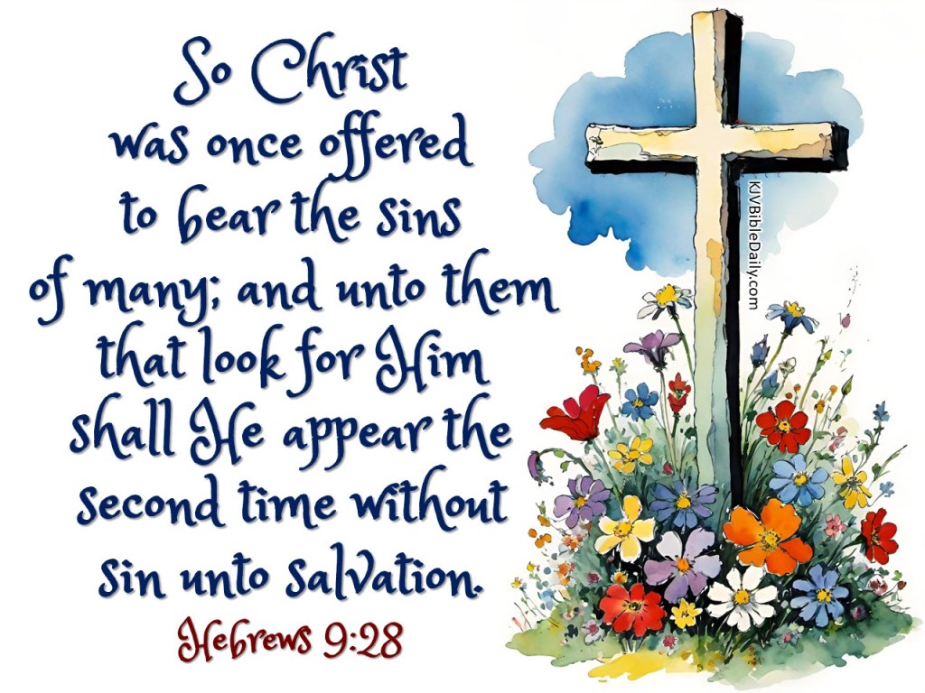 Hebrews 9:28 KJV Share this:Tweet Click to share on WhatsApp (Opens in new window) WhatsApp Click to print (Opens in new window) Print Click to share on Reddit (Opens in new window) Reddit Click to email a link to a friend (Opens in new window) Email Share on TumblrPocket Click to share on Telegram (Opens in new window) Telegram Like Loading... Related