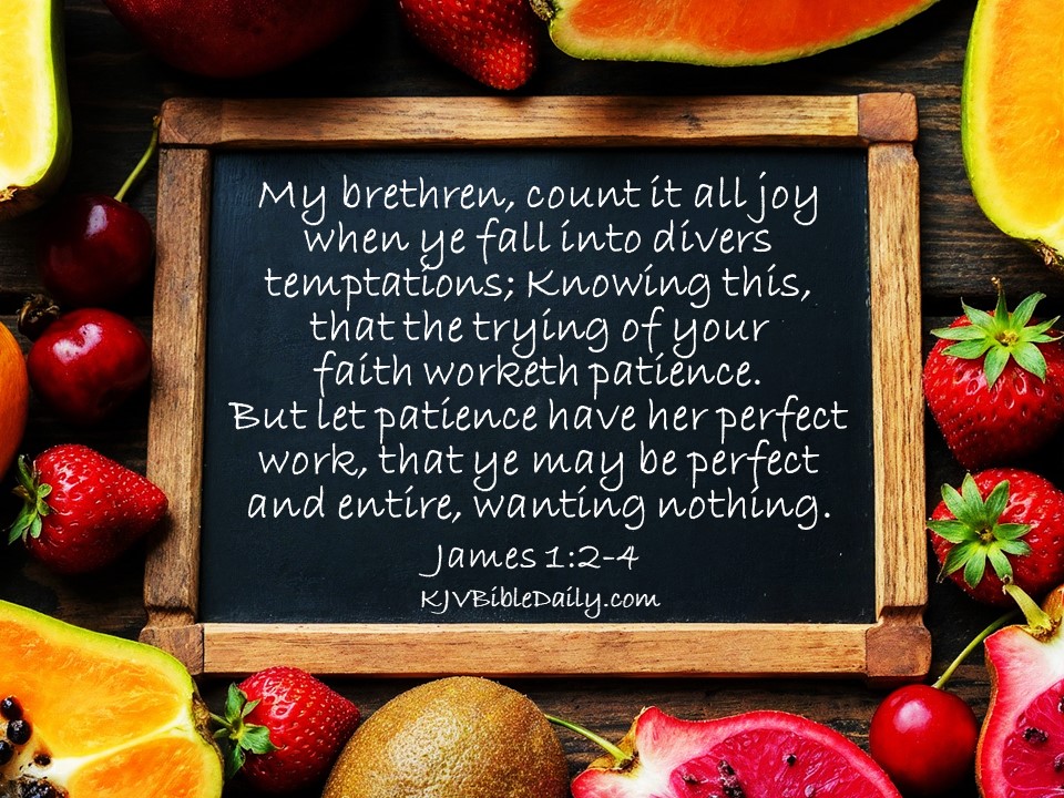James 1:2-4 KJV Share this:Tweet Click to share on WhatsApp (Opens in new window) WhatsApp Click to print (Opens in new window) Print Click to share on Reddit (Opens in new window) Reddit Click to email a link to a friend (Opens in new window) Email Share on TumblrPocket Click to share on Telegram (Opens in new window) Telegram Like Loading... Related