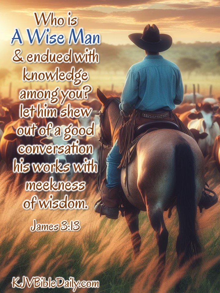 James 3:13 KJV Share this:Tweet Click to share on WhatsApp (Opens in new window) WhatsApp Click to print (Opens in new window) Print Click to share on Reddit (Opens in new window) Reddit Click to email a link to a friend (Opens in new window) Email Share on TumblrPocket Click to share on Telegram (Opens in new window) Telegram Like Loading... Related