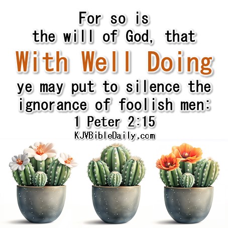 1 Peter 2:15 KJV Share this:Tweet Click to share on WhatsApp (Opens in new window) WhatsApp Click to print (Opens in new window) Print Click to share on Reddit (Opens in new window) Reddit Click to email a link to a friend (Opens in new window) Email Share on TumblrPocket Click to share on Telegram (Opens in new window) Telegram Like Loading... Related