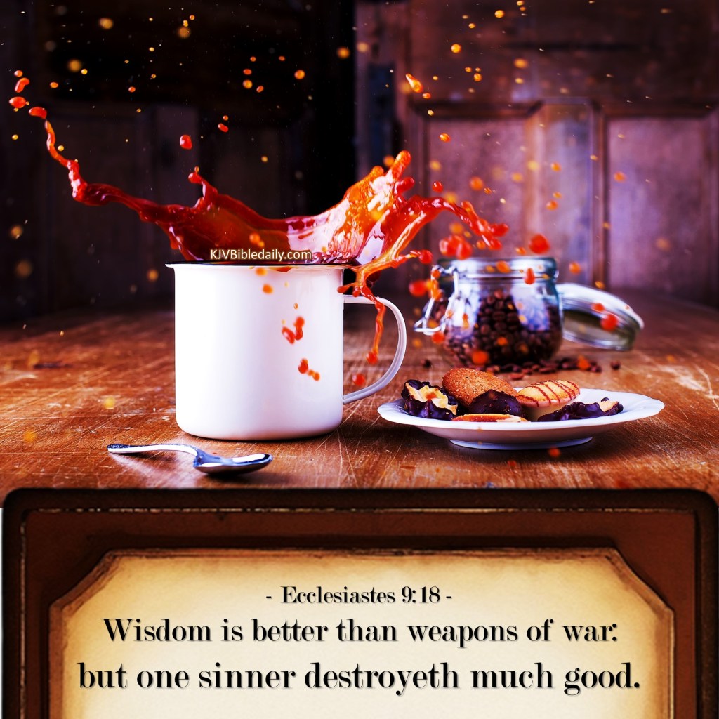 Ecclesiastes 9:18 KJV Share this:Tweet Click to share on WhatsApp (Opens in new window) WhatsApp Click to print (Opens in new window) Print Click to share on Reddit (Opens in new window) Reddit Click to email a link to a friend (Opens in new window) Email Share on TumblrPocket Click to share on Telegram (Opens in new window) Telegram Like Loading... Related