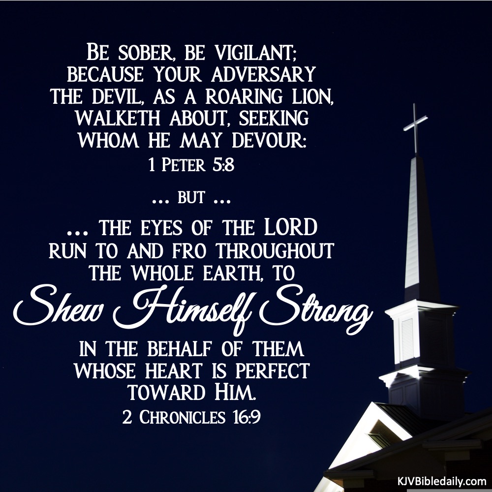 1 Peter 5:8 & 2 Chronicles 16:9 KJV Share this:Tweet Click to share on WhatsApp (Opens in new window) WhatsApp Click to print (Opens in new window) Print Click to share on Reddit (Opens in new window) Reddit Click to email a link to a friend (Opens in new window) Email Share on TumblrPocket Click to share on Telegram (Opens in new window) Telegram Like Loading... Related
