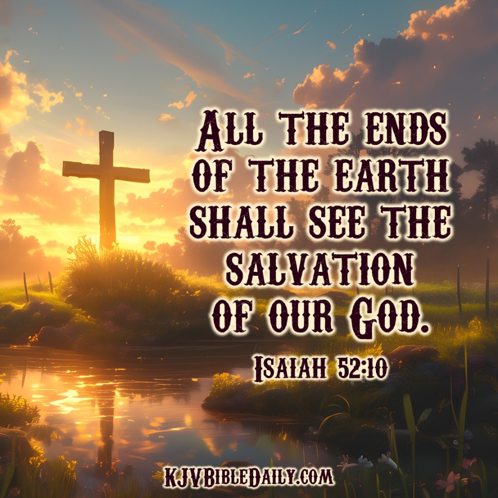 Isaiah 52:10 KJV Share this:Tweet Click to share on WhatsApp (Opens in new window) WhatsApp Click to print (Opens in new window) Print Click to share on Reddit (Opens in new window) Reddit Click to email a link to a friend (Opens in new window) Email Share on TumblrPocket Click to share on Telegram (Opens in new window) Telegram Like Loading... Related