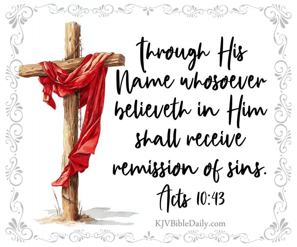 Acts 10:43 KJV Share this:Tweet Share on WhatsApp (Opens in new window) WhatsApp Print (Opens in new window) Print Share on Reddit (Opens in new window) Reddit Email a link to a friend (Opens in new window) Email Share on TumblrPocket Share on Telegram (Opens in new window) Telegram Like Loading... Related