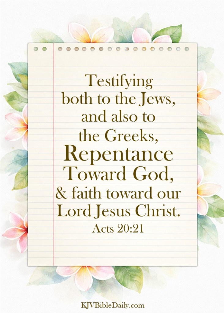 Acts 20:21 KJV Share this:Tweet Share on WhatsApp (Opens in new window) WhatsApp Print (Opens in new window) Print Share on Reddit (Opens in new window) Reddit Email a link to a friend (Opens in new window) Email Share on Tumblr Share on Telegram (Opens in new window) Telegram Like Loading... Related