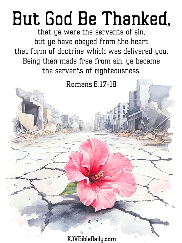 Romans 6:17-18 KJV Share this:Tweet Share on WhatsApp (Opens in new window) WhatsApp Print (Opens in new window) Print Share on Reddit (Opens in new window) Reddit Email a link to a friend (Opens in new window) Email Share on Tumblr Share on Telegram (Opens in new window) Telegram Like Loading... Related