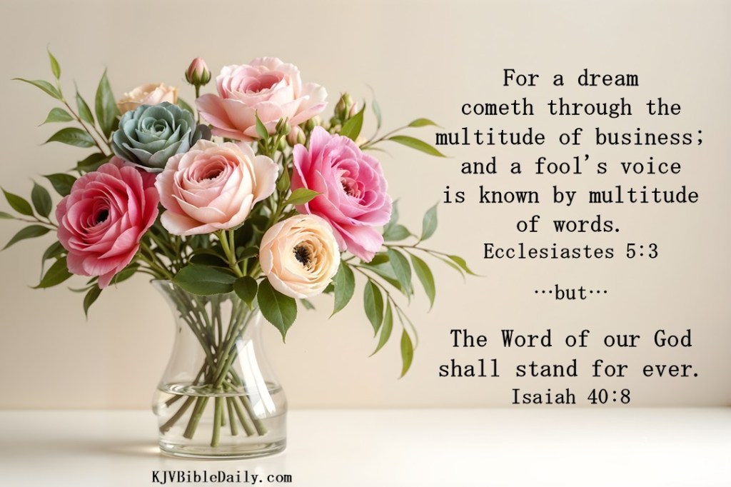 Ecclesiastes 5:3 KJV Share this:Tweet Share on WhatsApp (Opens in new window) WhatsApp Print (Opens in new window) Print Share on Reddit (Opens in new window) Reddit Email a link to a friend (Opens in new window) Email Share on Tumblr Share on Telegram (Opens in new window) Telegram Like Loading... Related