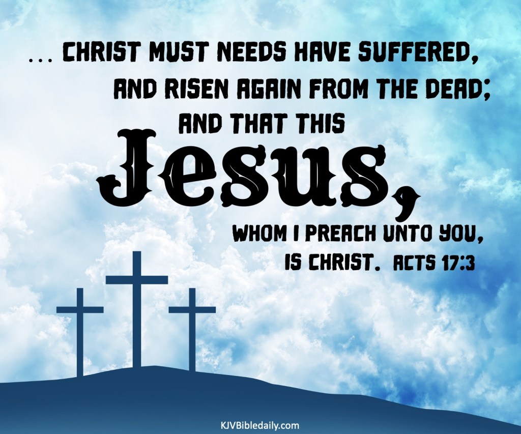 Acts 17:3 KJV Share this:Tweet Share on WhatsApp (Opens in new window) WhatsApp Print (Opens in new window) Print Share on Reddit (Opens in new window) Reddit Email a link to a friend (Opens in new window) Email Share on Tumblr Share on Telegram (Opens in new window) Telegram Like Loading...