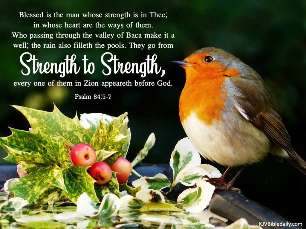 Psalm 84:5-7 KJV Share this:Tweet Share on WhatsApp (Opens in new window) WhatsApp Print (Opens in new window) Print Share on Reddit (Opens in new window) Reddit Email a link to a friend (Opens in new window) Email Share on Tumblr Share on Telegram (Opens in new window) Telegram Like Loading...