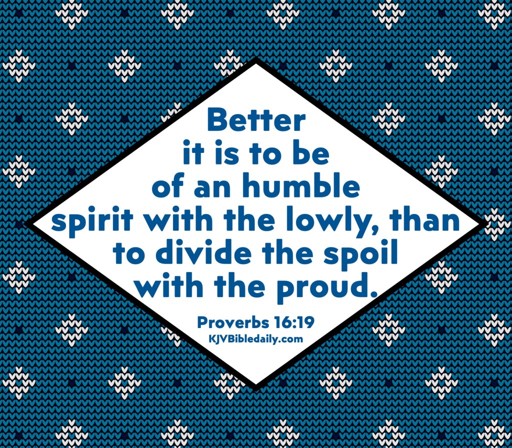 Proverbs 16:19 KJV Share this:Tweet Share on WhatsApp (Opens in new window) WhatsApp Print (Opens in new window) Print Share on Reddit (Opens in new window) Reddit Email a link to a friend (Opens in new window) Email Share on Tumblr Share on Telegram (Opens in new window) Telegram Like Loading...
