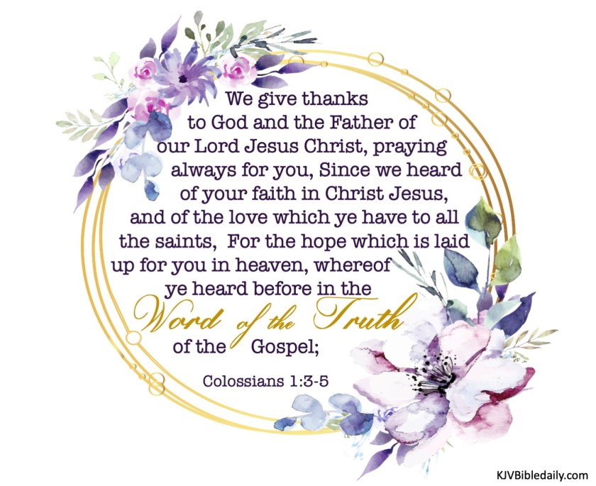 Previous Image Next Image Colossians 1-3-5 KJV Share this:Tweet Share on WhatsApp (Opens in new window) WhatsApp Print (Opens in new window) Print Share on Reddit (Opens in new window) Reddit Email a link to a friend (Opens in new window) Email Share on Tumblr Share on Telegram (Opens in new window) Telegram Like Loading...