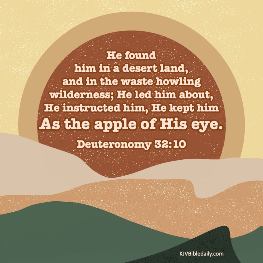 Previous Image Next Image Deuteronomy 32-10 KJV Share this:Tweet Share on WhatsApp (Opens in new window) WhatsApp Print (Opens in new window) Print Share on Reddit (Opens in new window) Reddit Email a link to a friend (Opens in new window) Email Share on Tumblr Share on Telegram (Opens in new window) Telegram Like Loading...