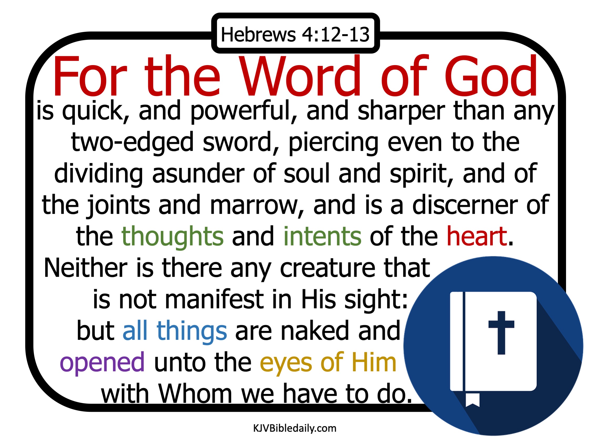 Previous Image Next Image hebrews-4-12-13-kjv Share this:Tweet Share on WhatsApp (Opens in new window) WhatsApp Print (Opens in new window) Print Share on Reddit (Opens in new window) Reddit Email a link to a friend (Opens in new window) Email Share on Tumblr Share on Telegram (Opens in new window) Telegram Like Loading...