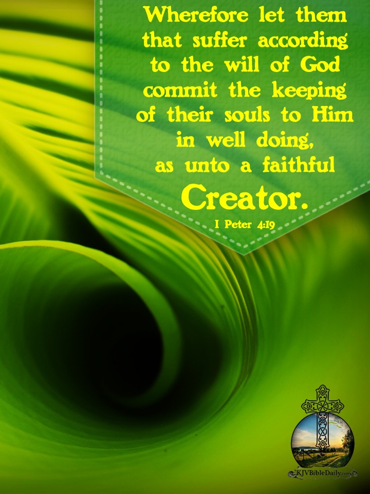 Previous Image Next Image I Peter 4 19 KJV Share this:Tweet Share on WhatsApp (Opens in new window) WhatsApp Print (Opens in new window) Print Share on Reddit (Opens in new window) Reddit Email a link to a friend (Opens in new window) Email Share on Tumblr Share on Telegram (Opens in new window) Telegram Like Loading...