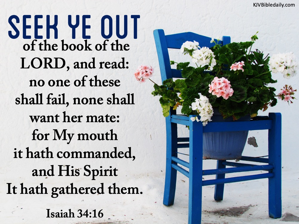 Previous Image Next Image Isaiah 34-16 KJV Share this:Tweet Share on WhatsApp (Opens in new window) WhatsApp Print (Opens in new window) Print Share on Reddit (Opens in new window) Reddit Email a link to a friend (Opens in new window) Email Share on TumblrPocket Share on Telegram (Opens in new window) Telegram Like Loading...