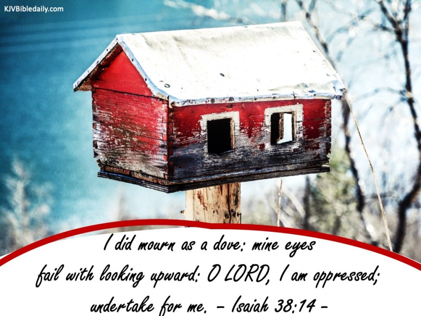 Previous Image Next Image Isaiah 38-14 KJV Share this:Tweet Share on WhatsApp (Opens in new window) WhatsApp Print (Opens in new window) Print Share on Reddit (Opens in new window) Reddit Email a link to a friend (Opens in new window) Email Share on TumblrPocket Share on Telegram (Opens in new window) Telegram Like Loading...