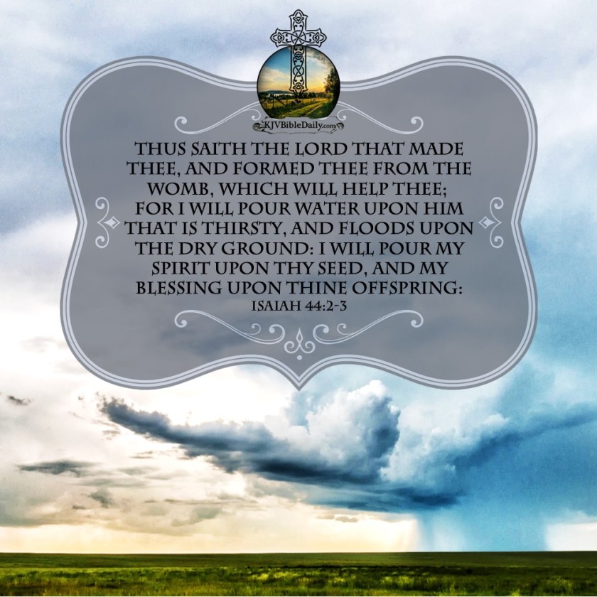 Previous Image Next Image Isaiah 44- 2-3 KJV Share this:Tweet Click to share on WhatsApp (Opens in new window) WhatsApp Click to print (Opens in new window) Print Click to share on Reddit (Opens in new window) Reddit Click to email a link to a friend (Opens in new window) Email Share on TumblrPocket Click to share on Telegram (Opens in new window) Telegram Like Loading...