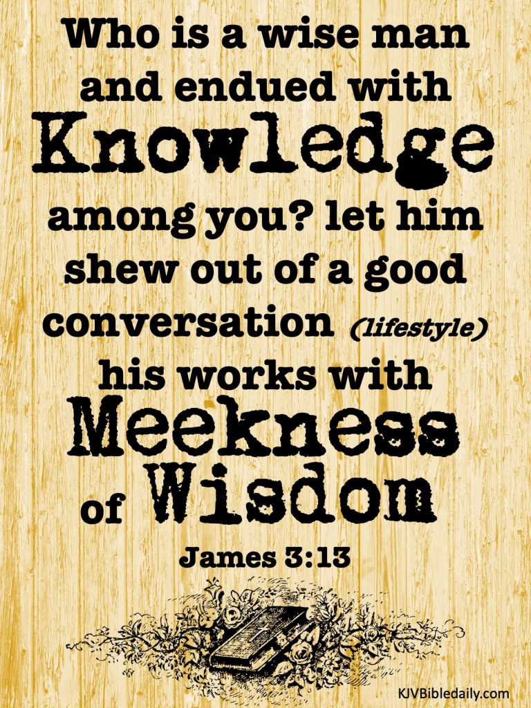 Previous Image Next Image James 3 13 KJV Share this:Tweet Share on WhatsApp (Opens in new window) WhatsApp Print (Opens in new window) Print Share on Reddit (Opens in new window) Reddit Email a link to a friend (Opens in new window) Email Share on Tumblr Share on Telegram (Opens in new window) Telegram Like Loading...