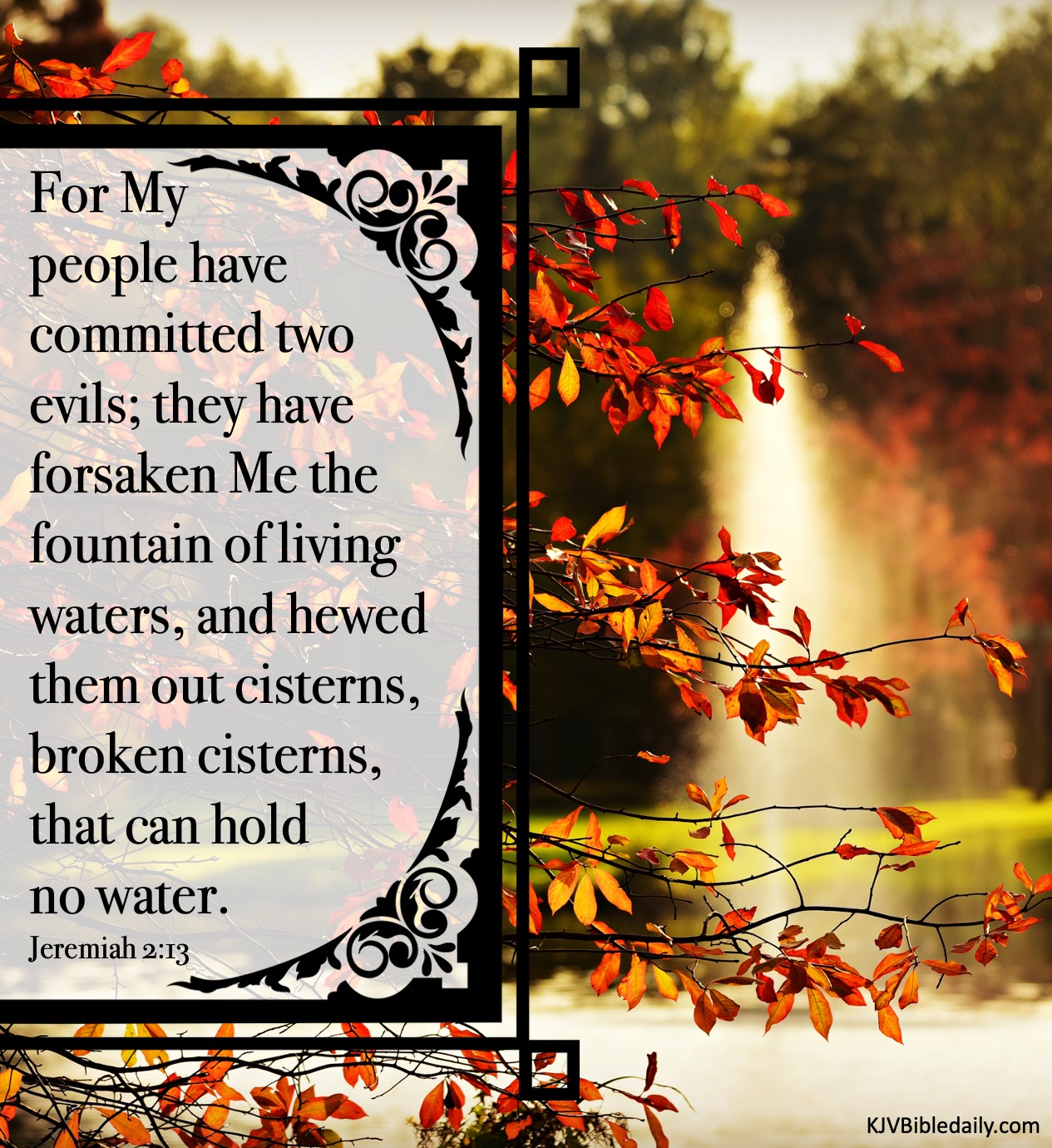 Previous Image Next Image Jeremiah 2-13 KJV Share this:Tweet Share on WhatsApp (Opens in new window) WhatsApp Print (Opens in new window) Print Share on Reddit (Opens in new window) Reddit Email a link to a friend (Opens in new window) Email Share on Tumblr Share on Telegram (Opens in new window) Telegram Like Loading...