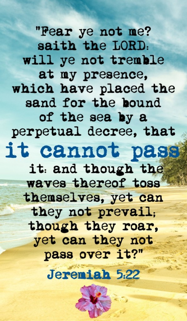 Previous Image Next Image Jeremiah 5.22 English Share this:Tweet Share on WhatsApp (Opens in new window) WhatsApp Print (Opens in new window) Print Share on Reddit (Opens in new window) Reddit Email a link to a friend (Opens in new window) Email Share on Tumblr Share on Telegram (Opens in new window) Telegram Like Loading...