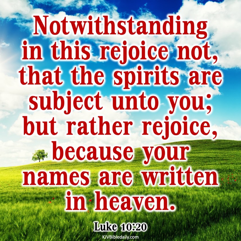 Previous Image Next Image luke-10-20-kjv Share this:Tweet Share on WhatsApp (Opens in new window) WhatsApp Print (Opens in new window) Print Share on Reddit (Opens in new window) Reddit Email a link to a friend (Opens in new window) Email Share on Tumblr Share on Telegram (Opens in new window) Telegram Like Loading...