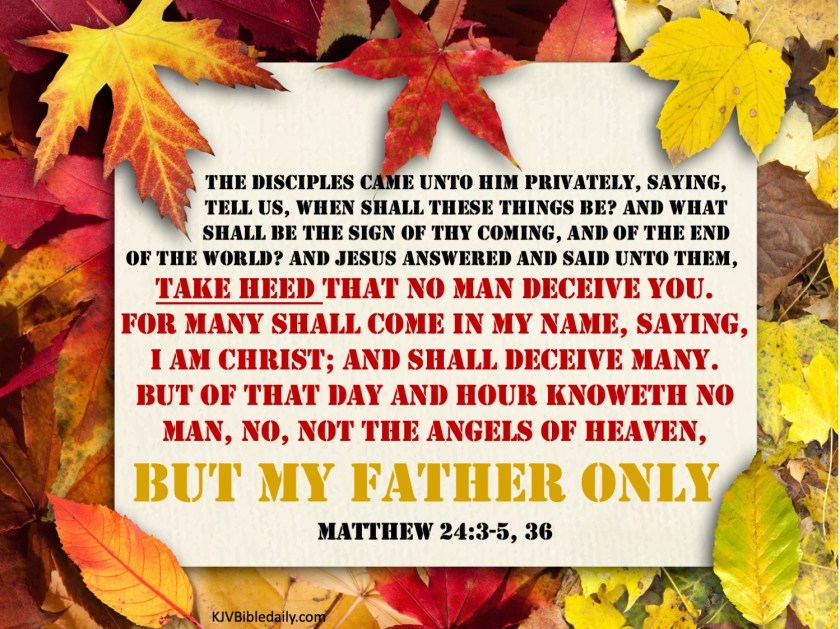 Previous Image Next Image matthew-24-3-5-36-kjv Share this:Tweet Share on WhatsApp (Opens in new window) WhatsApp Print (Opens in new window) Print Share on Reddit (Opens in new window) Reddit Email a link to a friend (Opens in new window) Email Share on Tumblr Share on Telegram (Opens in new window) Telegram Like Loading...