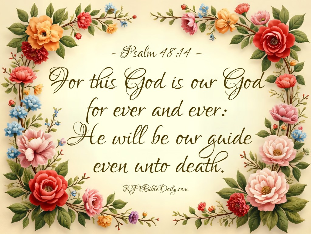 Psalm 48:14 KJV Share this:Tweet Share on WhatsApp (Opens in new window) WhatsApp Print (Opens in new window) Print Share on Reddit (Opens in new window) Reddit Email a link to a friend (Opens in new window) Email Share on Tumblr Share on Telegram (Opens in new window) Telegram Like Loading...