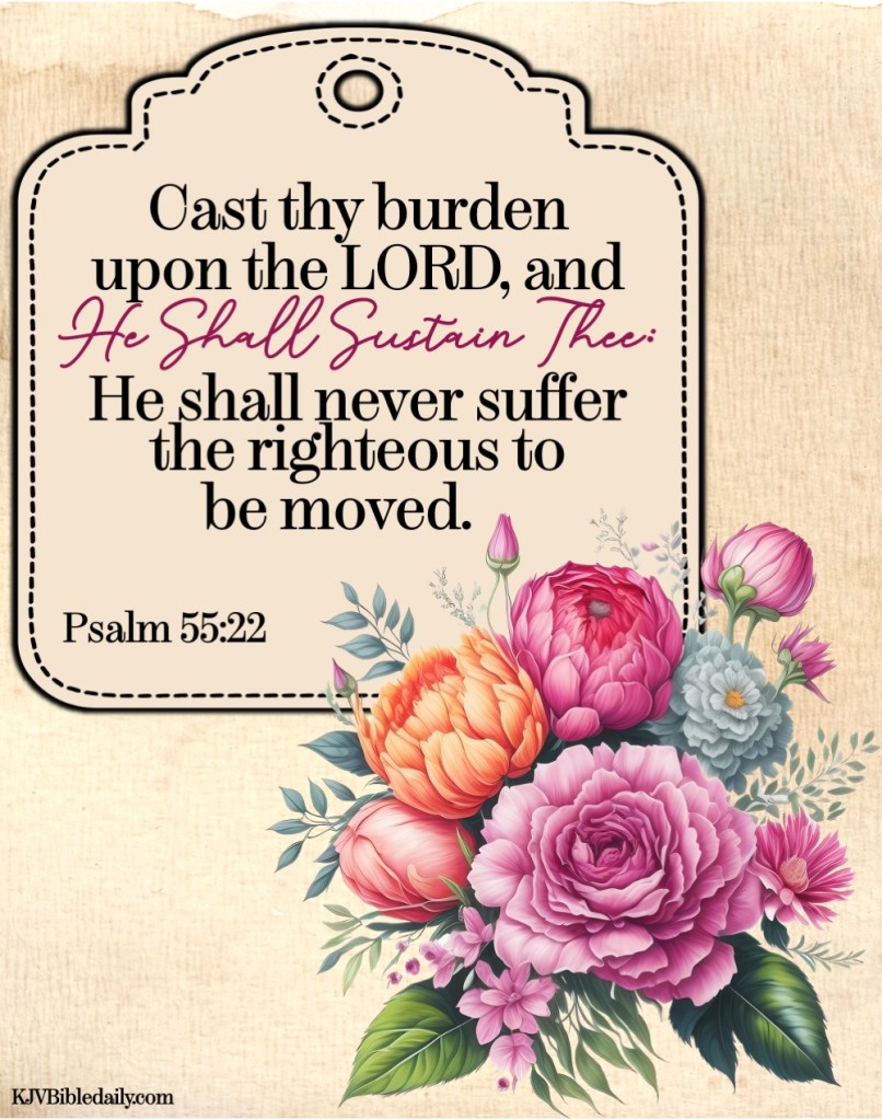 Psalm 55:22 KJV Share this:Tweet Share on WhatsApp (Opens in new window) WhatsApp Print (Opens in new window) Print Share on Reddit (Opens in new window) Reddit Email a link to a friend (Opens in new window) Email Share on Tumblr Share on Telegram (Opens in new window) Telegram Like Loading...
