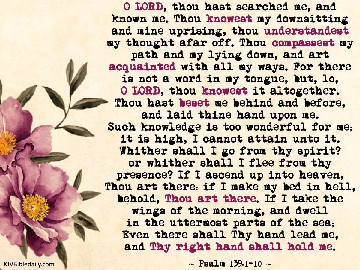Previous Image Next Image Psalm 139 1-10 KJV Share this:Tweet Share on WhatsApp (Opens in new window) WhatsApp Print (Opens in new window) Print Share on Reddit (Opens in new window) Reddit Email a link to a friend (Opens in new window) Email Share on Tumblr Share on Telegram (Opens in new window) Telegram Like Loading...