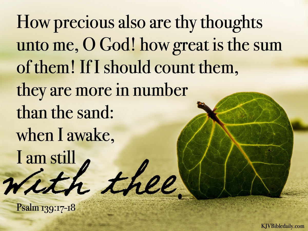 Previous Image Next Image Psalm 139 17-18 KJV Share this:Tweet Share on WhatsApp (Opens in new window) WhatsApp Print (Opens in new window) Print Share on Reddit (Opens in new window) Reddit Email a link to a friend (Opens in new window) Email Share on Tumblr Share on Telegram (Opens in new window) Telegram Like Loading...