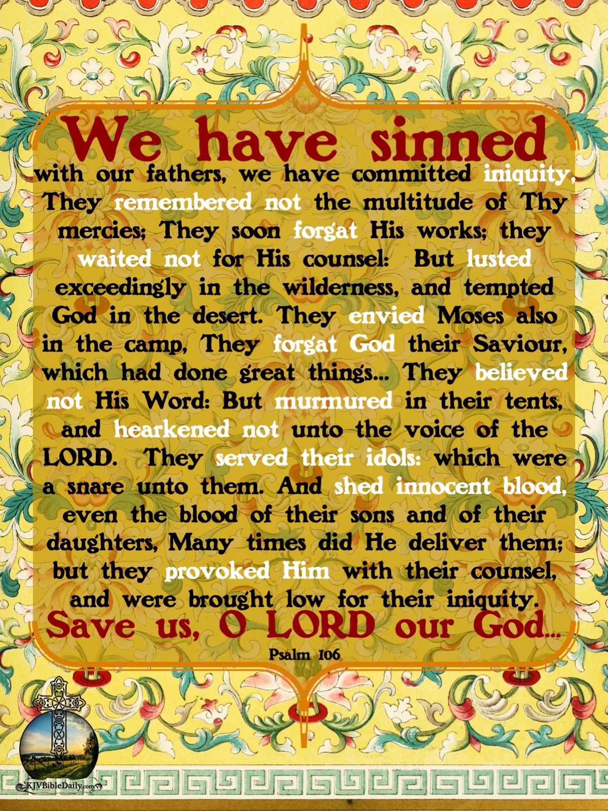 Previous Image Next Image Psalm 106 KJV Share this:Tweet Share on WhatsApp (Opens in new window) WhatsApp Print (Opens in new window) Print Share on Reddit (Opens in new window) Reddit Email a link to a friend (Opens in new window) Email Share on Tumblr Share on Telegram (Opens in new window) Telegram Like Loading...