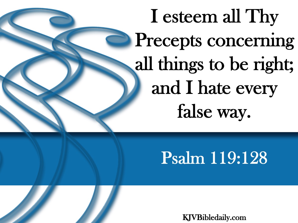 Previous Image Next Image Psalm 119 128 KJV Share this:Tweet Share on WhatsApp (Opens in new window) WhatsApp Print (Opens in new window) Print Share on Reddit (Opens in new window) Reddit Email a link to a friend (Opens in new window) Email Share on Tumblr Share on Telegram (Opens in new window) Telegram Like Loading...