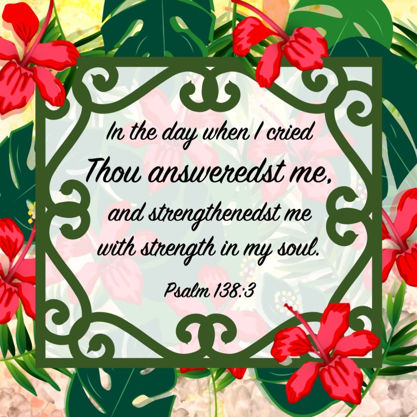Previous Image Next Image Psalm 138 3 KJV Share this:Tweet Share on WhatsApp (Opens in new window) WhatsApp Print (Opens in new window) Print Share on Reddit (Opens in new window) Reddit Email a link to a friend (Opens in new window) Email Share on Tumblr Share on Telegram (Opens in new window) Telegram Like Loading...