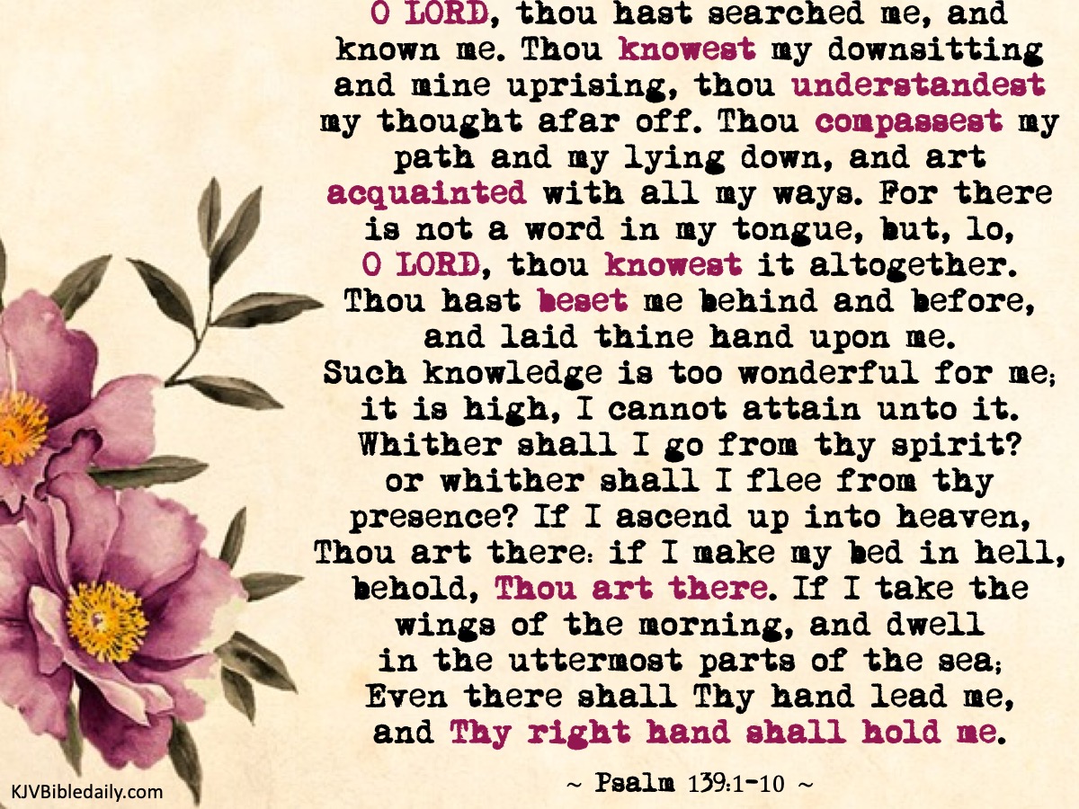 Previous Image Next Image Psalm 139 1-10 KJV Share this:Tweet Share on WhatsApp (Opens in new window) WhatsApp Print (Opens in new window) Print Share on Reddit (Opens in new window) Reddit Email a link to a friend (Opens in new window) Email Share on Tumblr Share on Telegram (Opens in new window) Telegram Like Loading...
