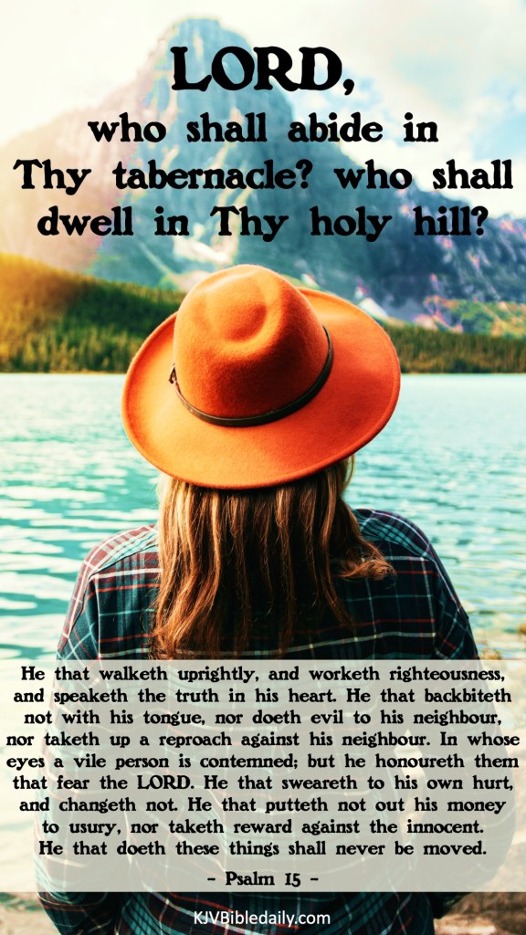 Previous Image Next Image Psalm 15 KJV Share this:Tweet Share on WhatsApp (Opens in new window) WhatsApp Print (Opens in new window) Print Share on Reddit (Opens in new window) Reddit Email a link to a friend (Opens in new window) Email Share on Tumblr Share on Telegram (Opens in new window) Telegram Like Loading...