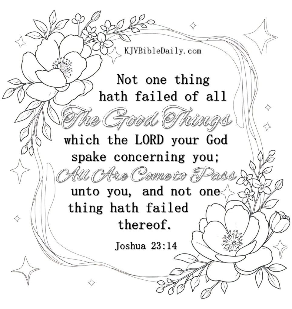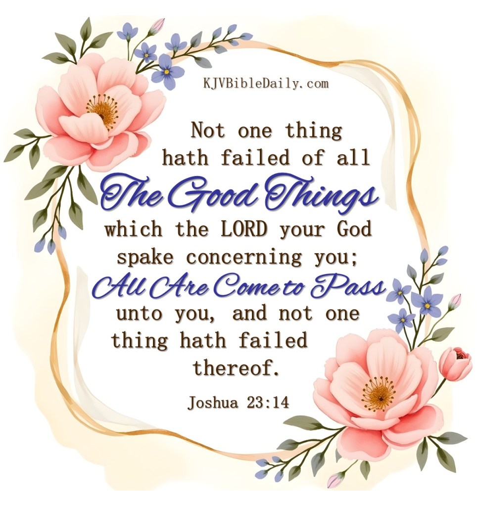 Joshua 23:14 KJV Share this:Tweet Share on WhatsApp (Opens in new window) WhatsApp Print (Opens in new window) Print Share on Reddit (Opens in new window) Reddit Email a link to a friend (Opens in new window) Email Share on Tumblr Share on Telegram (Opens in new window) Telegram Like Loading...