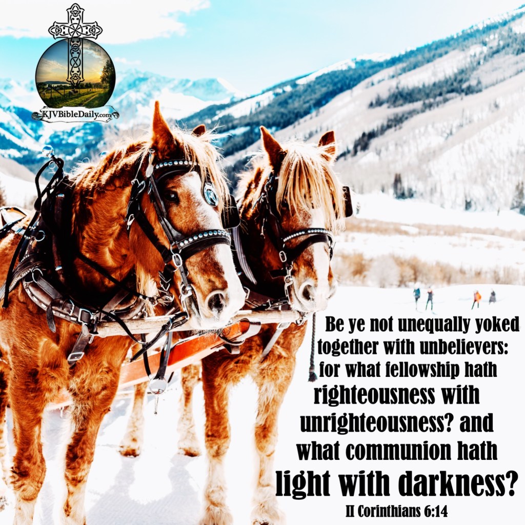 II Corinthians 6:14 KJV Share this:Tweet Share on WhatsApp (Opens in new window) WhatsApp Print (Opens in new window) Print Share on Reddit (Opens in new window) Reddit Email a link to a friend (Opens in new window) Email Share on Tumblr Share on Telegram (Opens in new window) Telegram Like Loading...