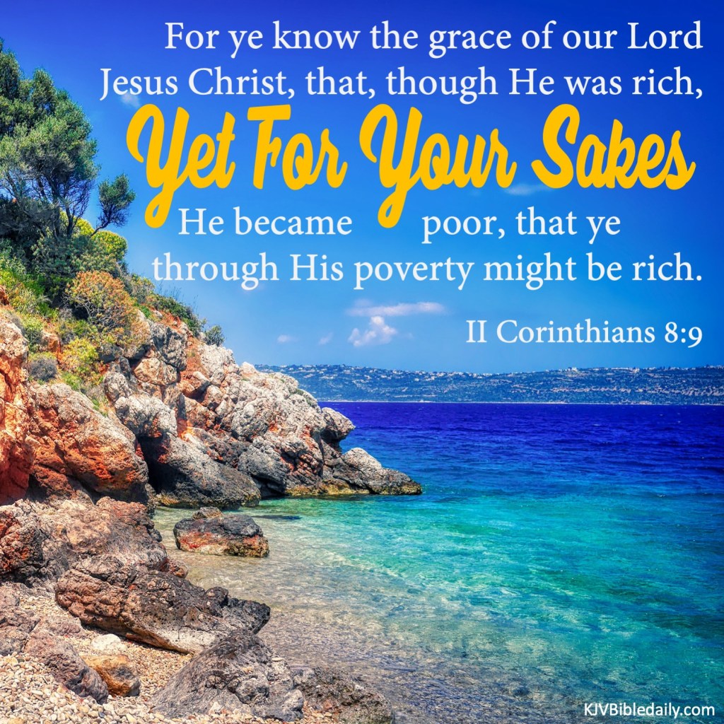 II Corinthians 8:9 KJV Share this:Tweet Share on WhatsApp (Opens in new window) WhatsApp Print (Opens in new window) Print Share on Reddit (Opens in new window) Reddit Email a link to a friend (Opens in new window) Email Share on Tumblr Share on Telegram (Opens in new window) Telegram Like Loading...