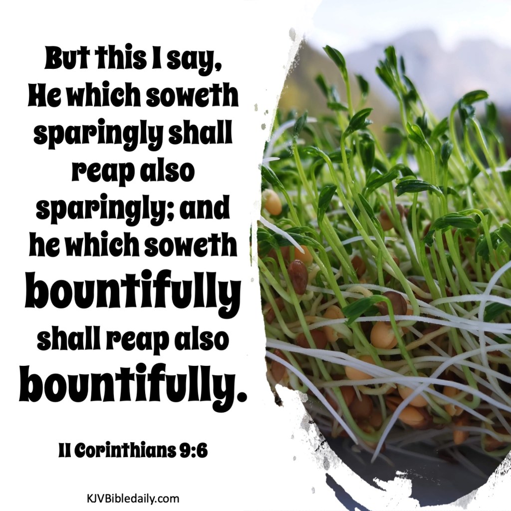 II Corinthians 9:6 KJV Share this:Tweet Share on WhatsApp (Opens in new window) WhatsApp Print (Opens in new window) Print Share on Reddit (Opens in new window) Reddit Email a link to a friend (Opens in new window) Email Share on Tumblr Share on Telegram (Opens in new window) Telegram Like Loading...
