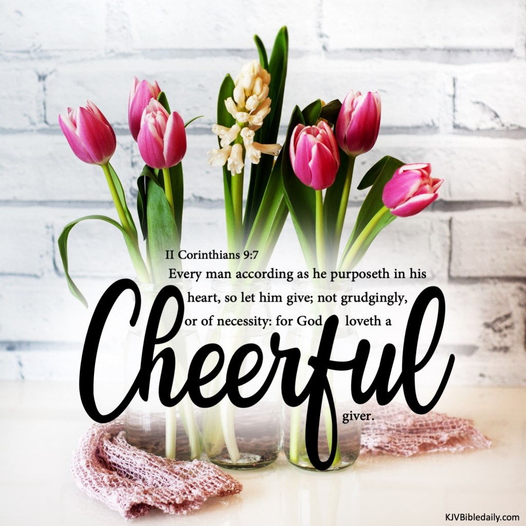 II Corinthians 9:7 KJV Share this:Tweet Share on WhatsApp (Opens in new window) WhatsApp Print (Opens in new window) Print Share on Reddit (Opens in new window) Reddit Email a link to a friend (Opens in new window) Email Share on Tumblr Share on Telegram (Opens in new window) Telegram Like Loading...