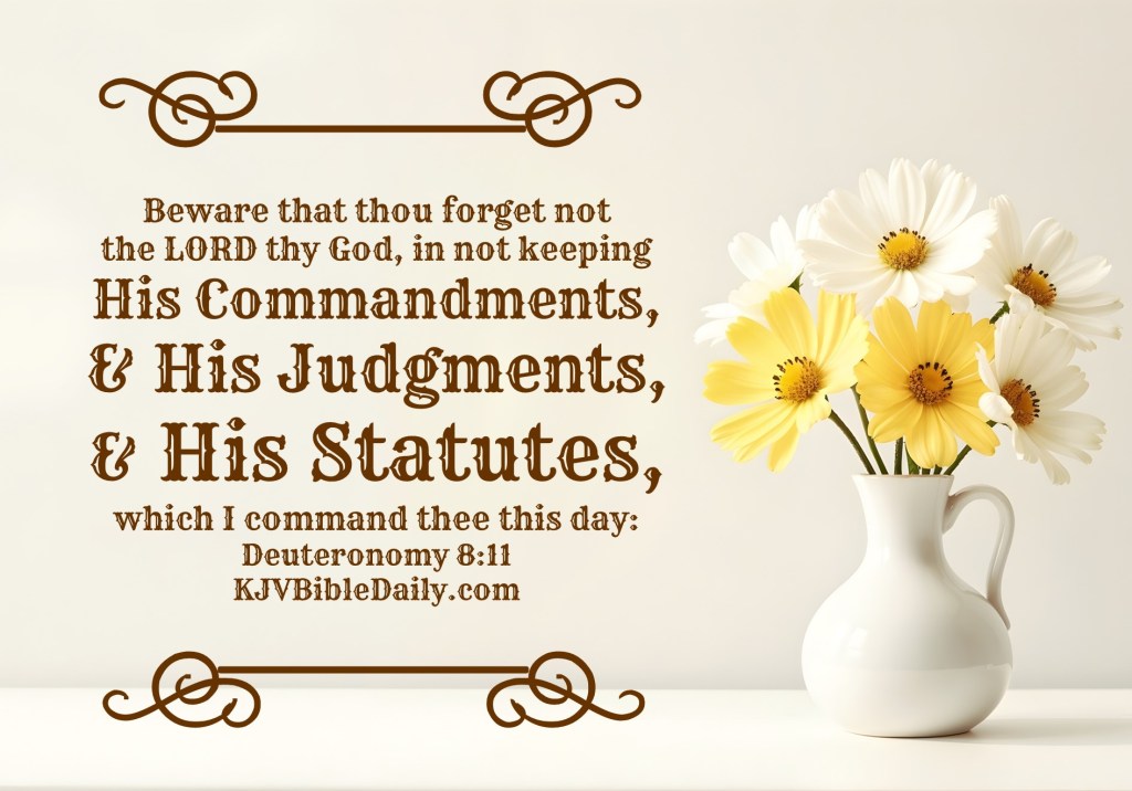 Deuteronomy 8:11 KJV Share this:Tweet Click to share on WhatsApp (Opens in new window) WhatsApp Click to print (Opens in new window) Print Click to share on Reddit (Opens in new window) Reddit Click to email a link to a friend (Opens in new window) Email Share on TumblrPocket Click to share on Telegram (Opens in new window) Telegram Like Loading...