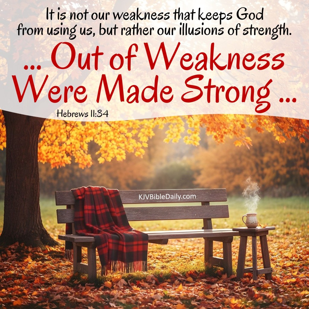 Hebrews 11:34 KJV Share this:Tweet Click to share on WhatsApp (Opens in new window) WhatsApp Click to print (Opens in new window) Print Click to share on Reddit (Opens in new window) Reddit Click to email a link to a friend (Opens in new window) Email Share on TumblrPocket Click to share on Telegram (Opens in new window) Telegram Like Loading...