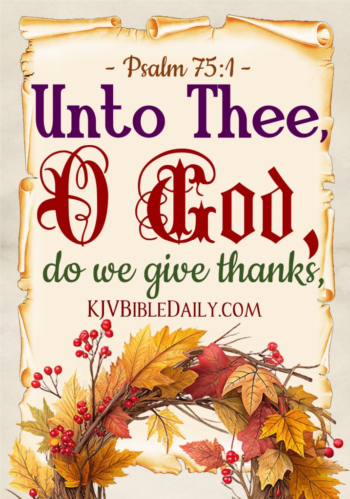 Psalm 75:1 KJV Share this:Tweet Click to share on WhatsApp (Opens in new window) WhatsApp Click to print (Opens in new window) Print Click to share on Reddit (Opens in new window) Reddit Click to email a link to a friend (Opens in new window) Email Share on TumblrPocket Click to share on Telegram (Opens in new window) Telegram Like Loading...